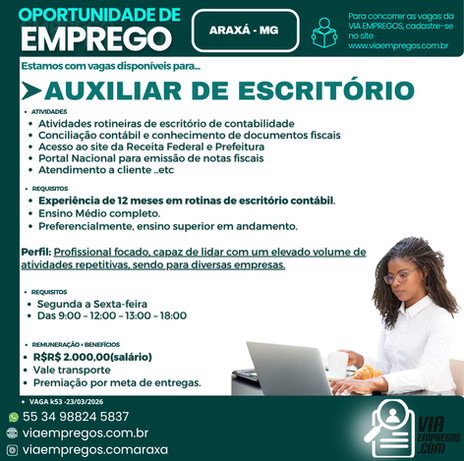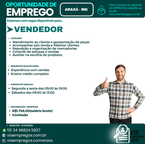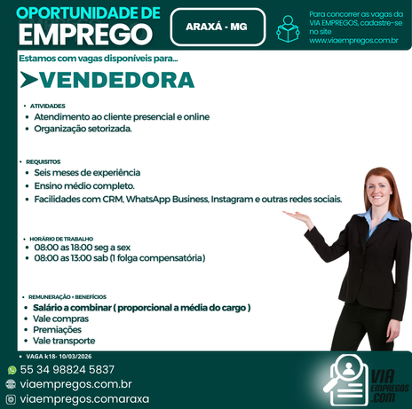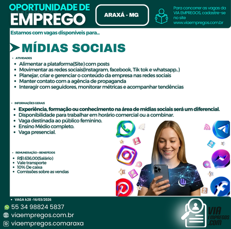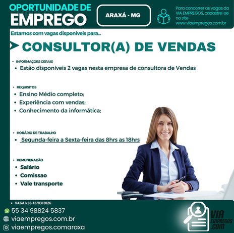 O objetivo da Via Empregos. com, é levar oportunidades , com qualidade, veracidade e orientação profissional a todos aqueles que buscarem nossos serviços. Pautamos nosso trabalho na seriedade, integridade, respeito e compromisso nos recrutamentos, seleções e encaminhamentos de pessoas para empresas parceiras em Araxá e Região .